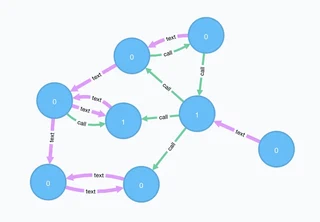 Network of dummy personas and their interactionsLet’s look at A graph containing vertices (persons) and edges (interactions, i.e. call or text) which might look like this graph of social interactions, 1 denotes the bad people we know of. Having loaded the graph into a graph database like neo4j allows for easy queries of the social network of a :Person. To check the network for hidden terrorists, I select other nodes which are up to 3 edges away from the original node and calculate the fraudulence as the average of all its neighbours, i.e. their interactions