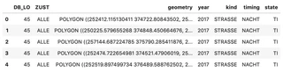 1	45	ALLE	POLYGON ((250225.579655268 374848.450664676, 2...	STRASSE	TI	NACHT	2017