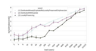 200 events per user per period for 3 periods. Load of users (x axis), processing time shown in logarithmic scale (y axis) for the 3 different implementations of a spatial join. Each one was run 5 times. The graph shows the mean and 95% confidence intervals as error bars.