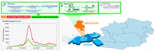 Visual representation of the methodological approach. For every one of the 116 districts in Austria the epidemiological curve of the district is compared to the epidemiological curve of the corresponding federal state. This figure shows the example of the district Innsbruck (orange) in the federal state Tyrol. The epidemiological curves are calculated employing an age-structured compartmental model. The red curve is the epidemiological curve for Innsbruck assuming transmis- sion rates that equal those observed in Tyrol (blue). By including a dependence of the transmission rate on weather, interventions and mobility (green), the district-independent effect sizes of these district-specific input variables can be calculated.Abstract